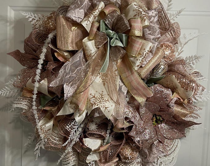 Winter Wreath for Front Door, Rose Gold Mesh Wreath, Christmas Wreath Decor, Christmas Decor, Holiday Wreath, Christmas Wreath with Lights
